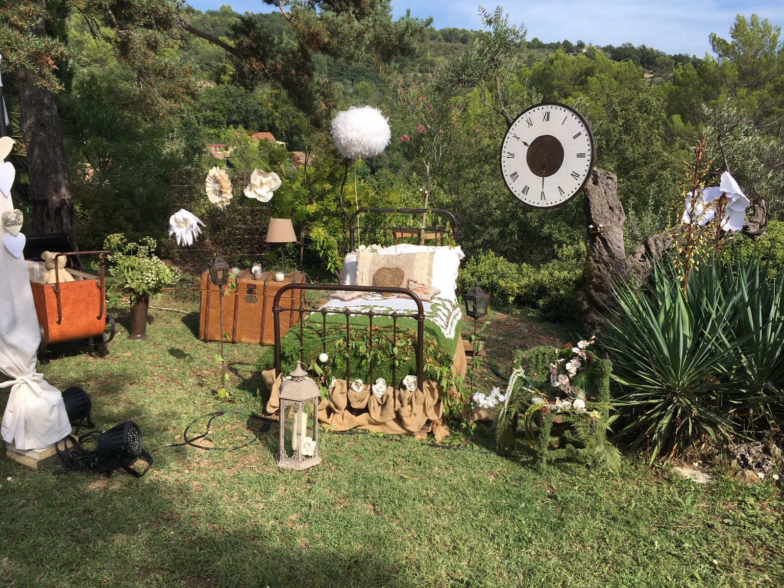 A l’occasion d’un mariage, nous avons utilisé une baignoire et un arrosoir en zinc. Des fibres optiques dans l’arrosoir donnent un effet d’eau et éclairent le fond de la baignoire.