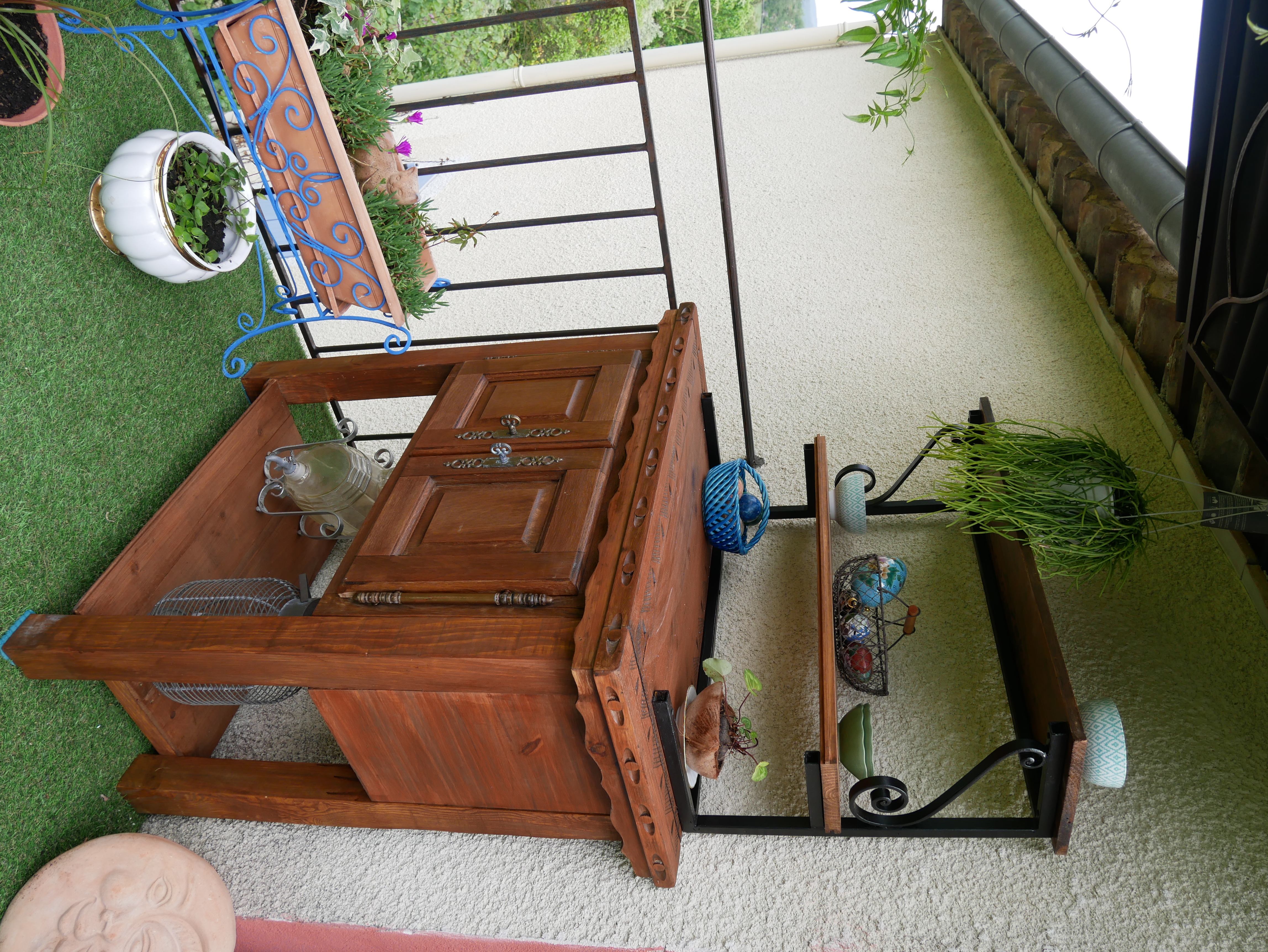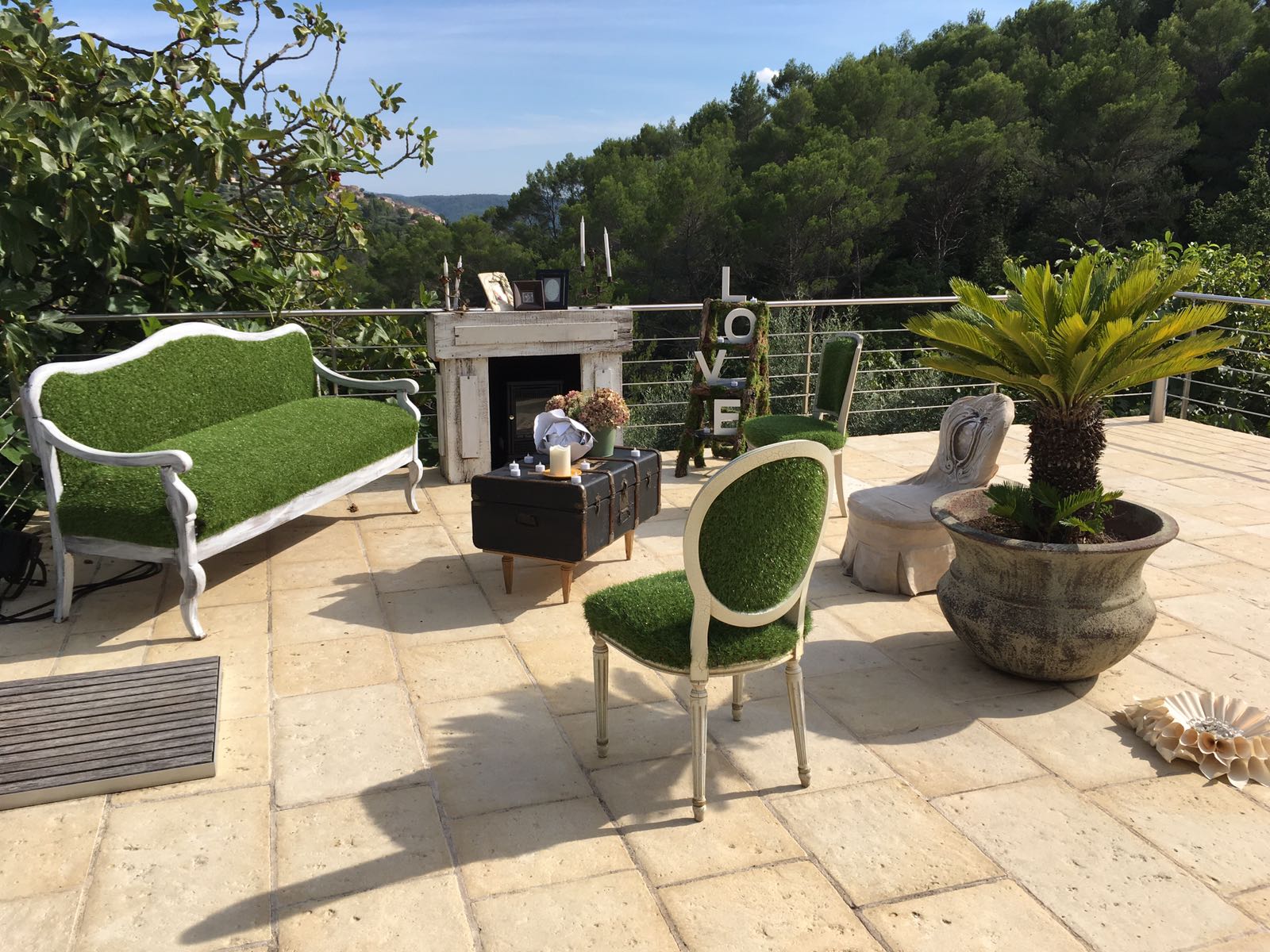 Ce balcon a été décoré avec un lustre en plâtre turquoise, des cadres végétalisés et des coussins faits sur mesure.